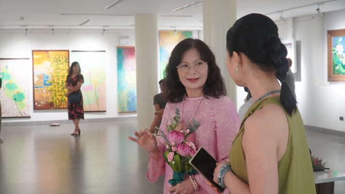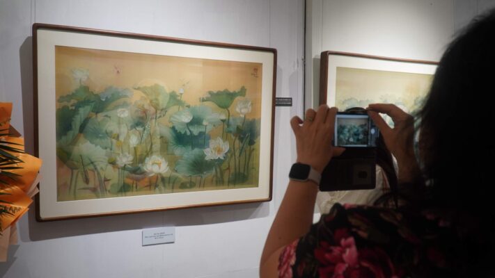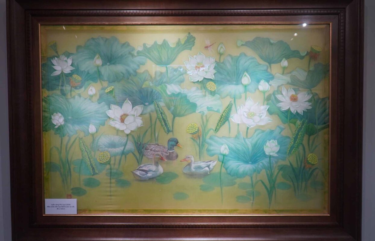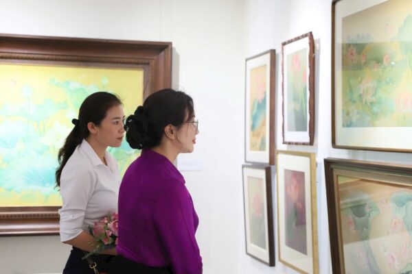 The exhibition features a rich collection of works from renowned contemporary artists. Through diverse materials such as silk, lacquer, oil, and watercolors, the artists portray the lotus—a symbol of purity, strength, and the noble character of President Ho Chi Minh.